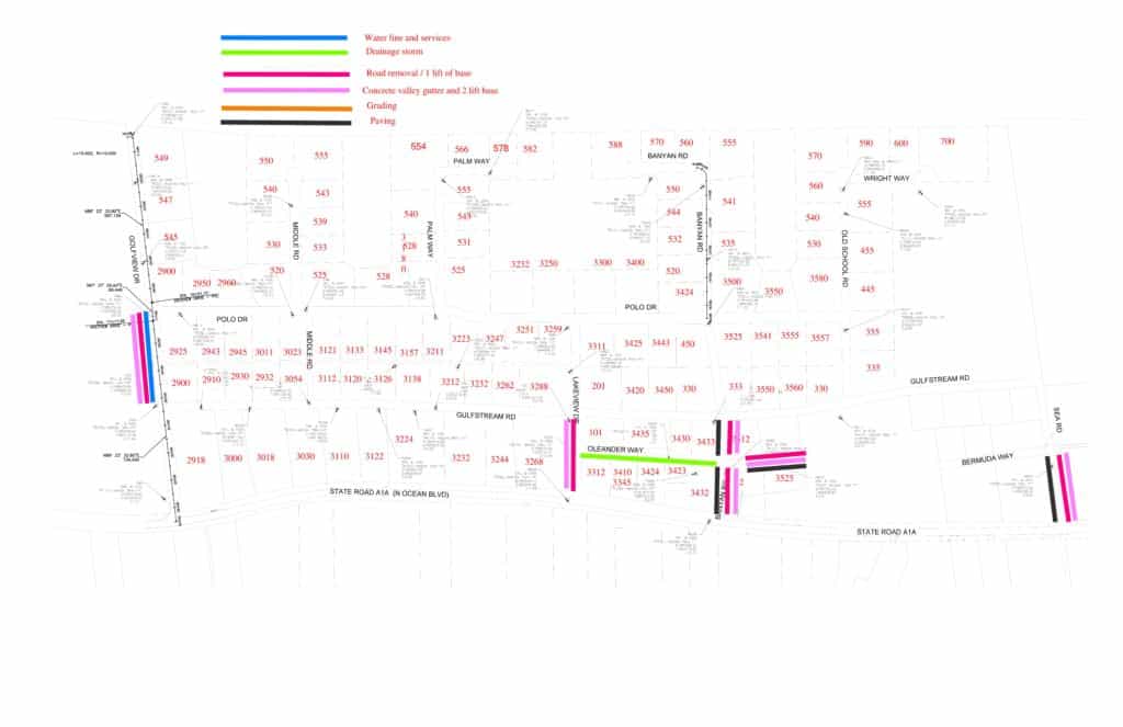 - Remove road, install base, and construct concrete valley gutters on Lakeview Drive between Gulfstream Road and A1A.