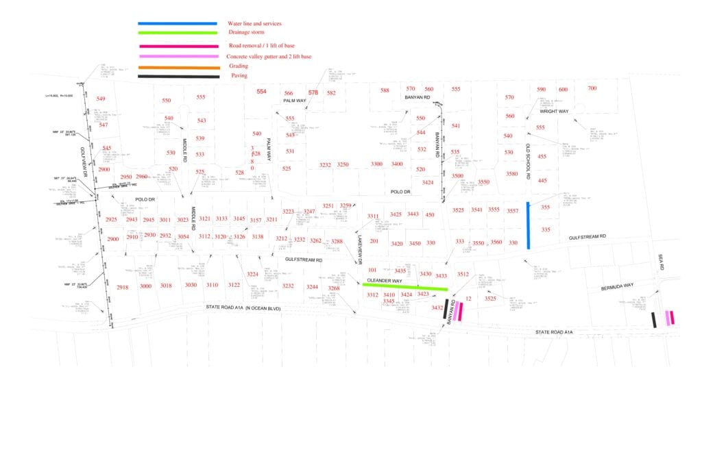 • Remove road, construct concrete valley gutters, install road rock base, and pave Banyan Road between A1A and Oleander Way.